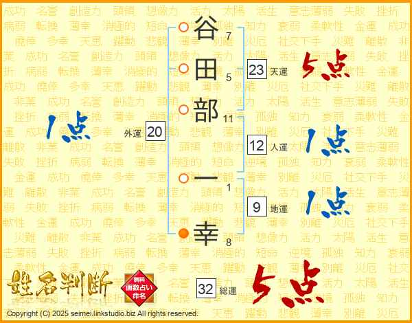 谷田部一幸さんの天運は23画の5点!