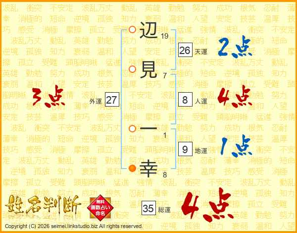 生活面を象徴する運勢です。外部から受ける影響力を表し、結婚運、家庭運や職場、環境への順応性を表します。総運から人運を引いた画数。姓や名が1文字の場合を除く。
