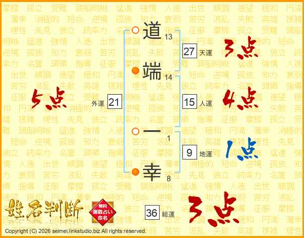 生活面を象徴する運勢です。外部から受ける影響力を表し、結婚運、家庭運や職場、環境への順応性を表します。総運から人運を引いた画数。姓や名が1文字の場合を除く。