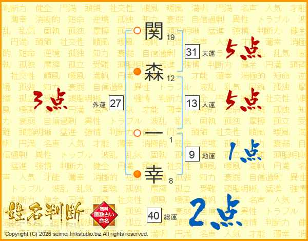 生活面を象徴する運勢です。外部から受ける影響力を表し、結婚運、家庭運や職場、環境への順応性を表します。総運から人運を引いた画数。姓や名が1文字の場合を除く。