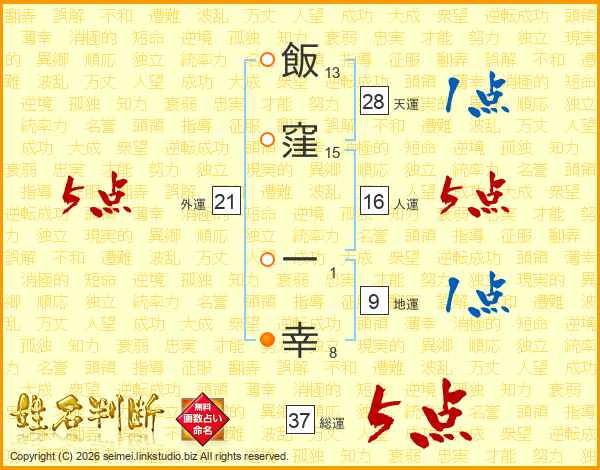 飯(13画)窪(15画) 一(1画)幸(8画)
