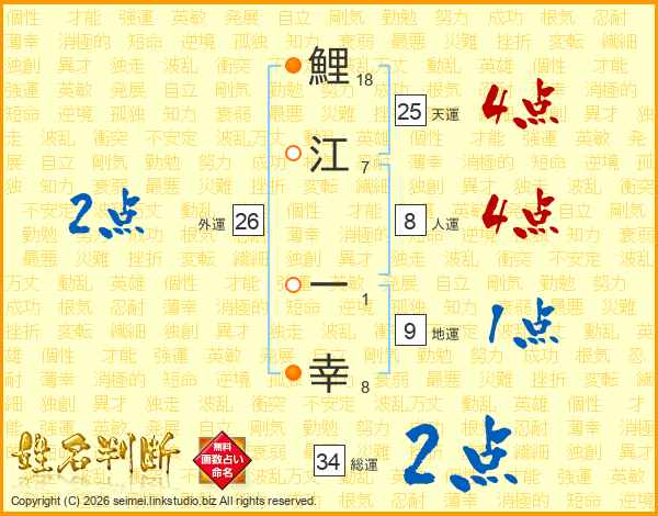 鯉(18画)江(7画) 一(1画)幸(8画)