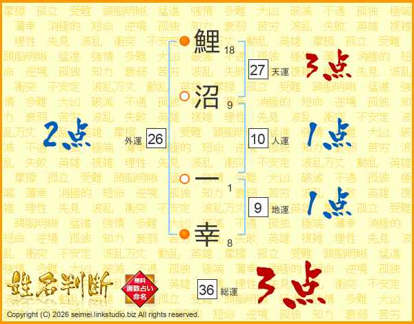 鯉(18画)沼(9画) 一(1画)幸(8画)