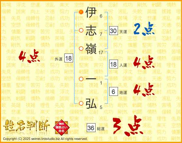 伊(6画)志(7画)嶺(17画) 一(1画)弘(5画)