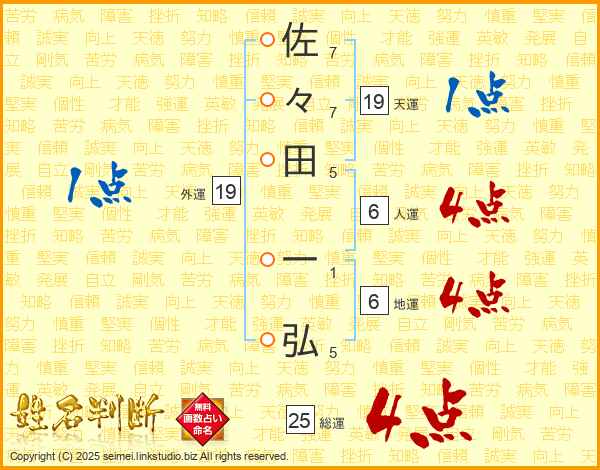 佐(7画)々(7画)田(5画) 一(1画)弘(5画)