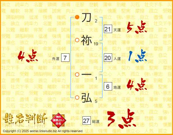 刀祢一弘さんの総運は27画の3点!