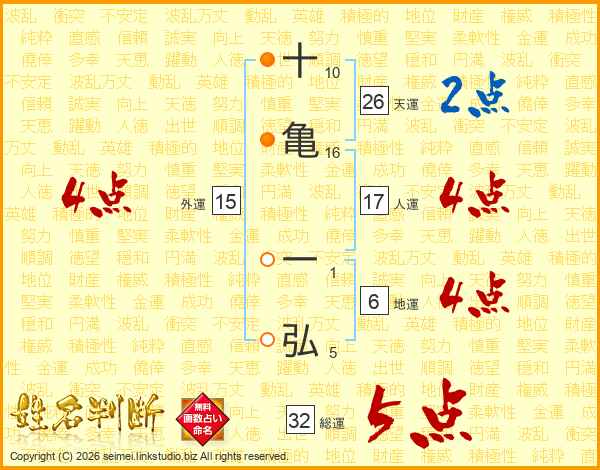 生活面を象徴する運勢です。外部から受ける影響力を表し、結婚運、家庭運や職場、環境への順応性を表します。総運から人運を引いた画数。姓や名が1文字の場合を除く。