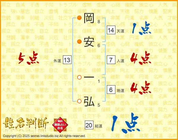 生活面を象徴する運勢です。外部から受ける影響力を表し、結婚運、家庭運や職場、環境への順応性を表します。総運から人運を引いた画数。姓や名が1文字の場合を除く。
