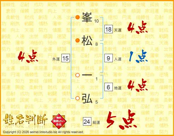 あなたの人生を表す1番重要な運勢です。生涯を通じて影響する総合運となり、主に50歳以降の晩年期に影響を及ぼします。苗字と名前の合計画数。