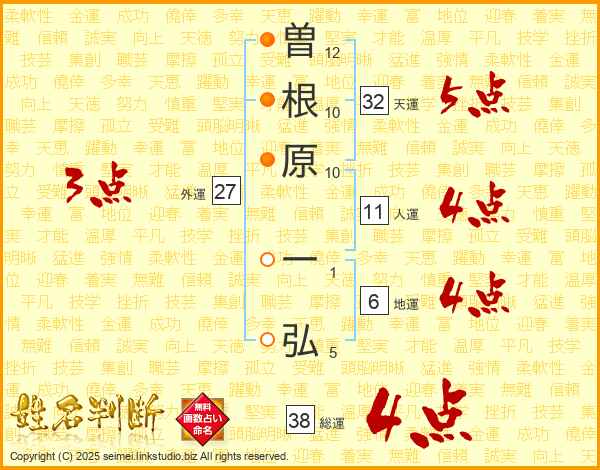 曽(12画)根(10画)原(10画) 一(1画)弘(5画)