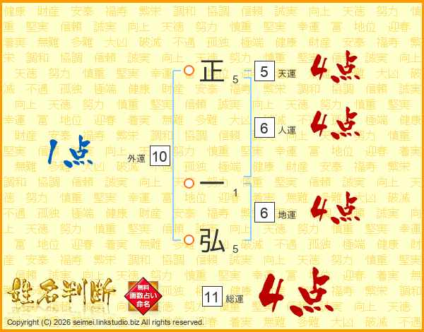 あなたの人生を表す1番重要な運勢です。生涯を通じて影響する総合運となり、主に50歳以降の晩年期に影響を及ぼします。苗字と名前の合計画数。