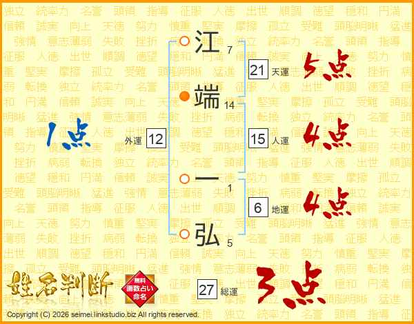 生活面を象徴する運勢です。外部から受ける影響力を表し、結婚運、家庭運や職場、環境への順応性を表します。総運から人運を引いた画数。姓や名が1文字の場合を除く。