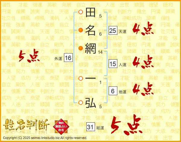 田(5画)名(6画)網(14画) 一(1画)弘(5画)