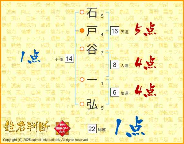 石(5画)戸(4画)谷(7画) 一(1画)弘(5画)