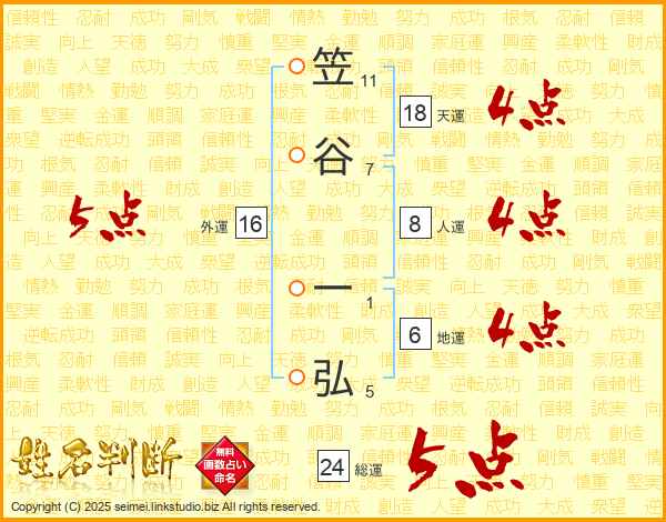 笠(11画)谷(7画) 一(1画)弘(5画)