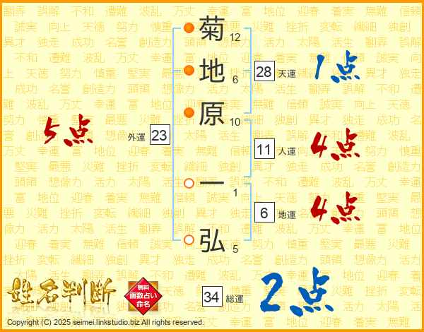 菊(12画)地(6画)原(10画) 一(1画)弘(5画)