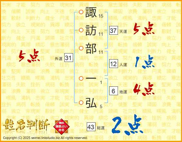 諏(15画)訪(11画)部(11画) 一(1画)弘(5画)