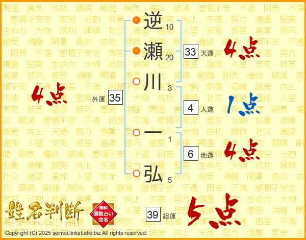 逆(10画)瀬(20画)川(3画) 一(1画)弘(5画)