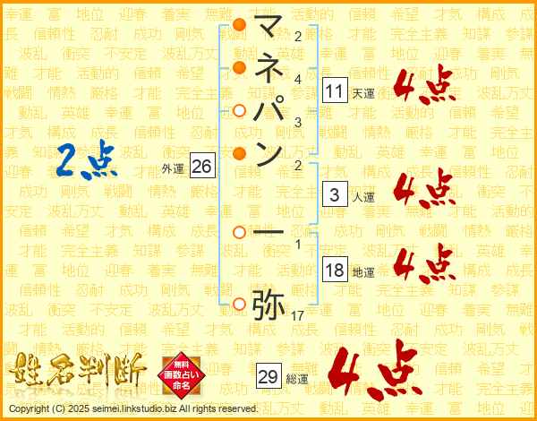マ(2画)ネ(4画)パ(3画)ン(2画) 一(1画)弥(17画)