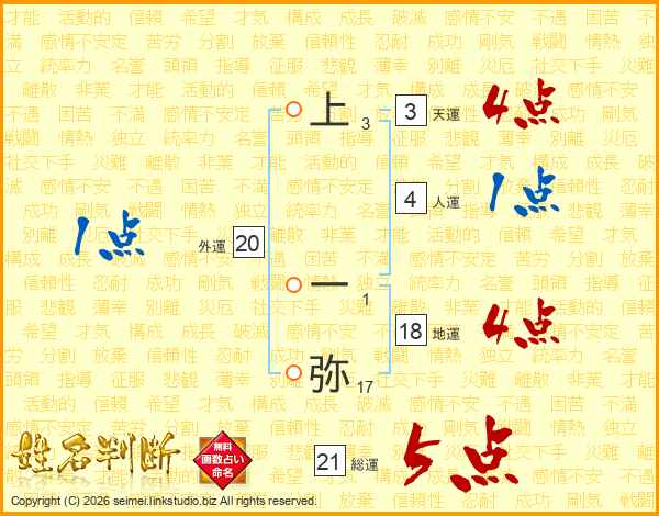 生活面を象徴する運勢です。外部から受ける影響力を表し、結婚運、家庭運や職場、環境への順応性を表します。総運から人運を引いた画数。姓や名が1文字の場合を除く。