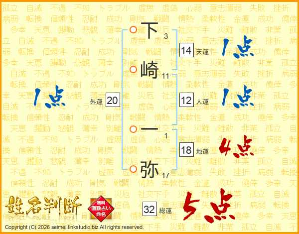 生活面を象徴する運勢です。外部から受ける影響力を表し、結婚運、家庭運や職場、環境への順応性を表します。総運から人運を引いた画数。姓や名が1文字の場合を除く。