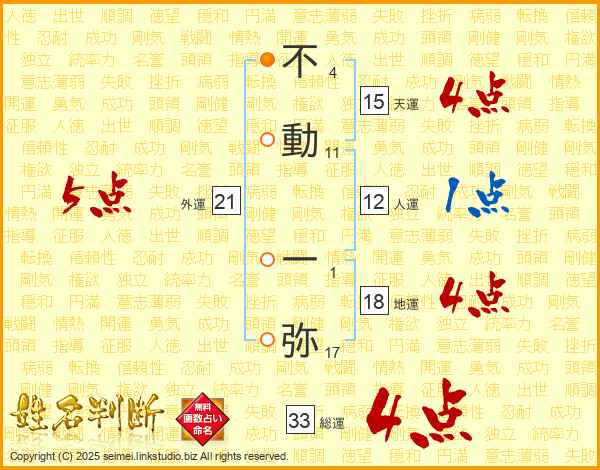 生活面を象徴する運勢です。外部から受ける影響力を表し、結婚運、家庭運や職場、環境への順応性を表します。総運から人運を引いた画数。姓や名が1文字の場合を除く。