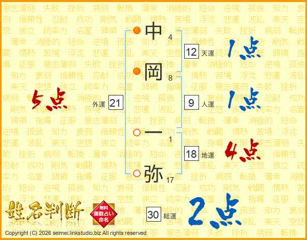 中(4画)岡(8画) 一(1画)弥(17画)
