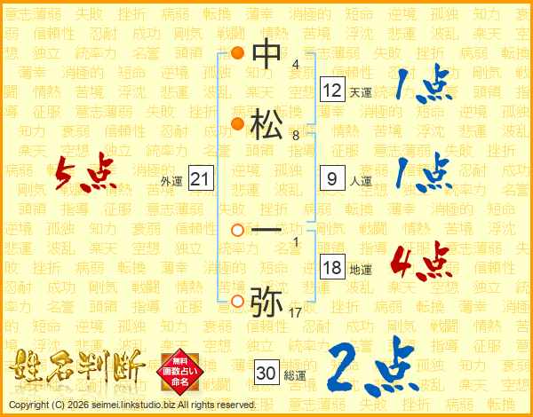 生活面を象徴する運勢です。外部から受ける影響力を表し、結婚運、家庭運や職場、環境への順応性を表します。総運から人運を引いた画数。姓や名が1文字の場合を除く。