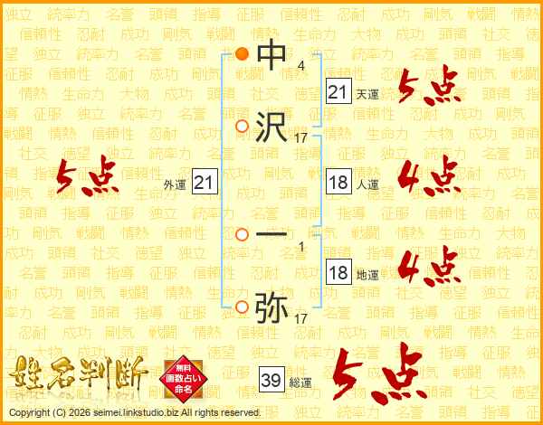 中沢一弥さんの総運は39画の5点!