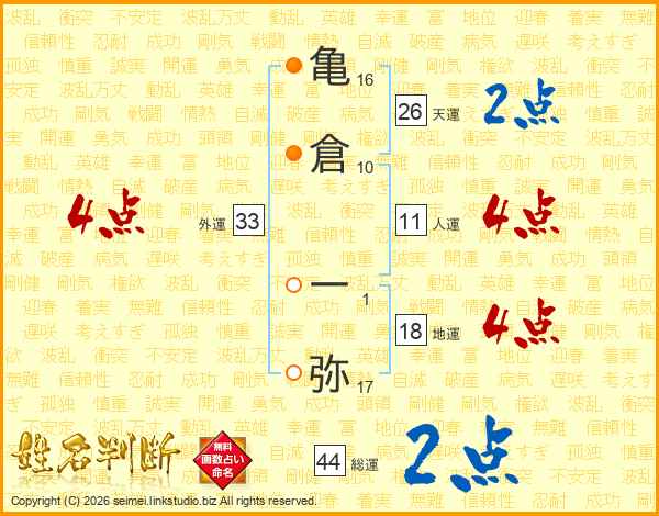 亀(16画)倉(10画) 一(1画)弥(17画)
