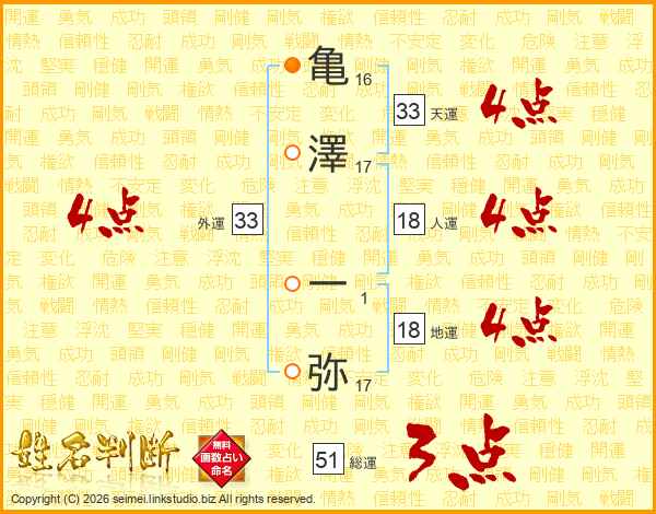 亀(16画)澤(17画) 一(1画)弥(17画)