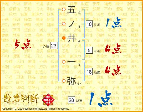 五(5画)ノ(1画)井(4画) 一(1画)弥(17画)