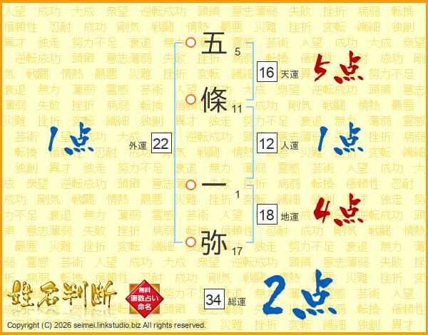 画数の奇数(○陽)と偶数(●陰)の配列で吉凶を占います。どちらかにかたよる名前は大凶名で避ける必要があります。画数の奇数偶数。