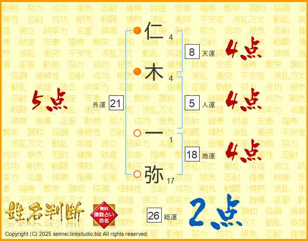 生活面を象徴する運勢です。外部から受ける影響力を表し、結婚運、家庭運や職場、環境への順応性を表します。総運から人運を引いた画数。姓や名が1文字の場合を除く。