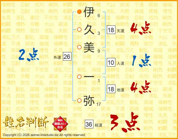 伊(6画)久(3画)美(9画) 一(1画)弥(17画)