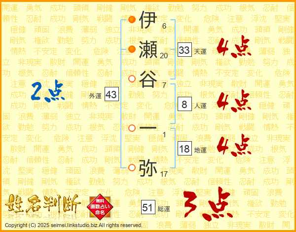 伊(6画)瀬(20画)谷(7画) 一(1画)弥(17画)