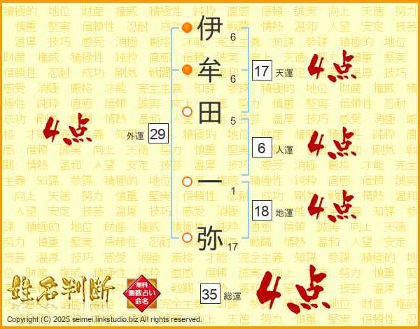 伊(6画)牟(6画)田(5画) 一(1画)弥(17画)