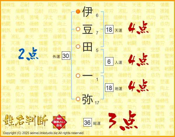 伊(6画)豆(7画)田(5画) 一(1画)弥(17画)