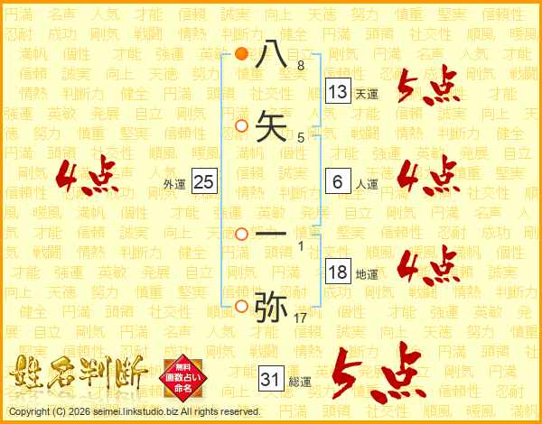 八矢一弥さんの天運は13画の5点!