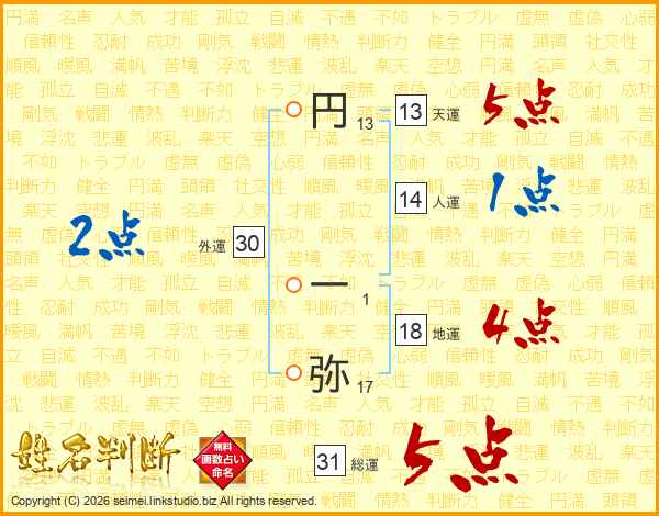 生活面を象徴する運勢です。外部から受ける影響力を表し、結婚運、家庭運や職場、環境への順応性を表します。総運から人運を引いた画数。姓や名が1文字の場合を除く。