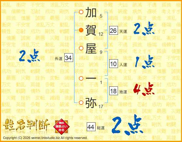 加(5画)賀(12画)屋(9画) 一(1画)弥(17画)