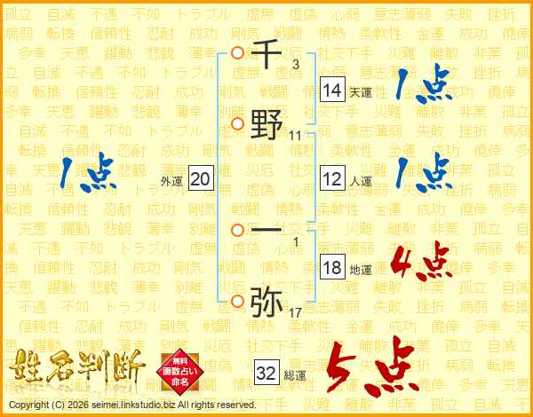 生活面を象徴する運勢です。外部から受ける影響力を表し、結婚運、家庭運や職場、環境への順応性を表します。総運から人運を引いた画数。姓や名が1文字の場合を除く。