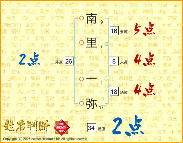 生活面を象徴する運勢です。外部から受ける影響力を表し、結婚運、家庭運や職場、環境への順応性を表します。総運から人運を引いた画数。姓や名が1文字の場合を除く。
