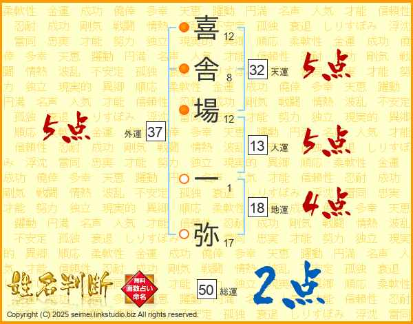 喜(12画)舎(8画)場(12画) 一(1画)弥(17画)
