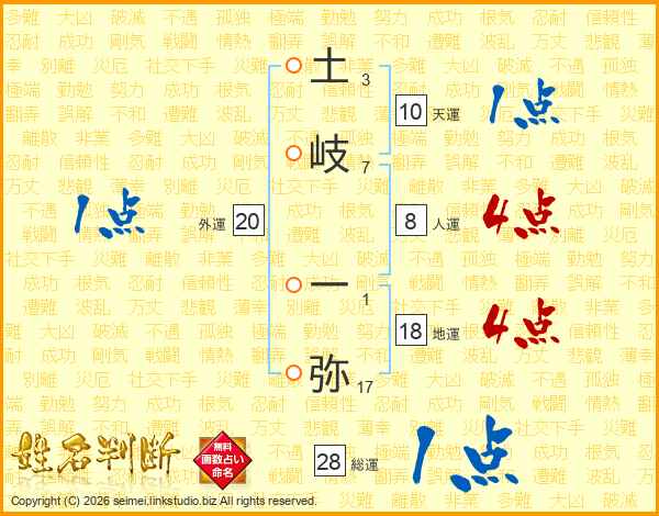 土(3画)岐(7画) 一(1画)弥(17画)