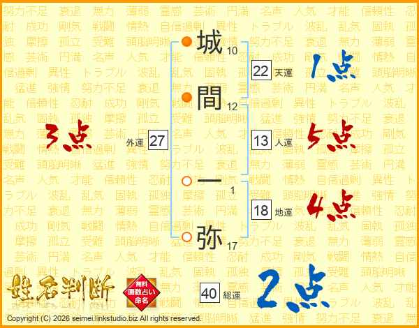 生活面を象徴する運勢です。外部から受ける影響力を表し、結婚運、家庭運や職場、環境への順応性を表します。総運から人運を引いた画数。姓や名が1文字の場合を除く。