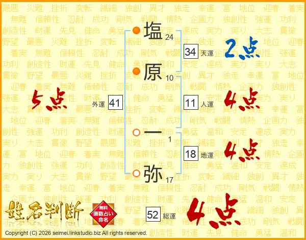 塩原一弥さんの総運は52画の4点!