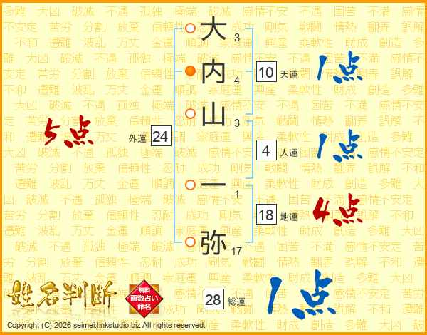 大(3画)内(4画)山(3画) 一(1画)弥(17画)
