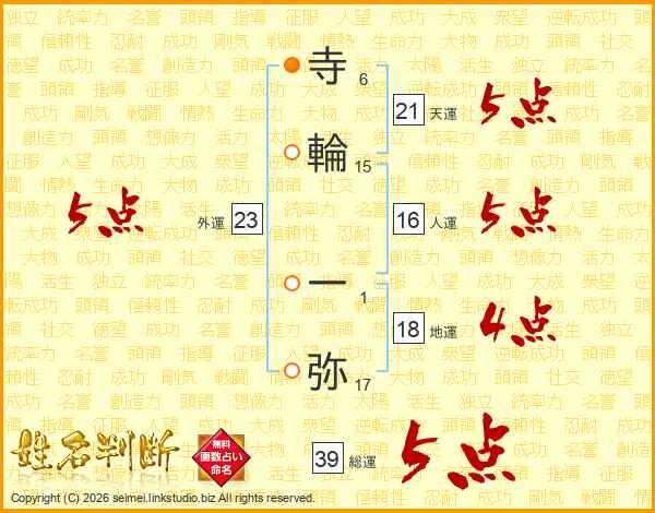 寺輪一弥さんの総運は39画の5点!
