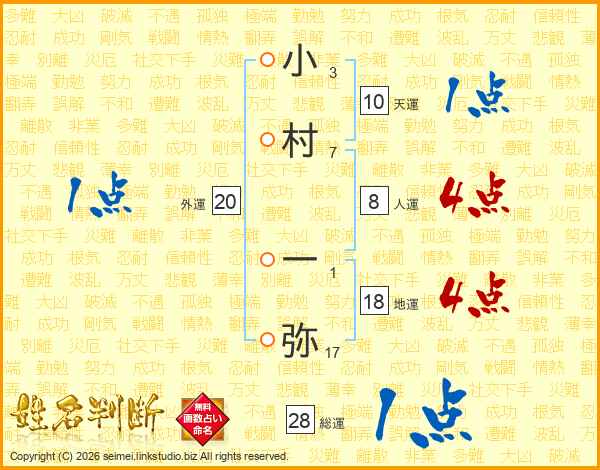生活面を象徴する運勢です。外部から受ける影響力を表し、結婚運、家庭運や職場、環境への順応性を表します。総運から人運を引いた画数。姓や名が1文字の場合を除く。
